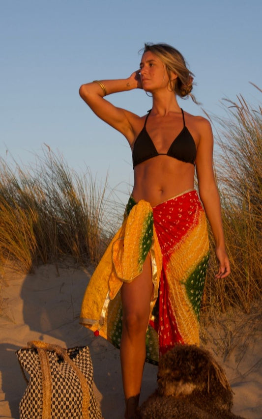 Sumérgete en el verano con nuestra exclusiva colección de playa, que presenta pareos únicos hechos a partir de telas de saris reciclados y decorados con mandalas vibrantes. Cada pareo es una pieza artesanal que combina tradición y modernidad, ofreciendo un estilo bohemio y exótico perfecto para tus días de sol.